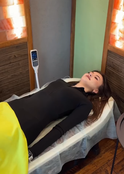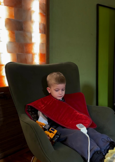 Сеанс доповнюється прогріванням турмаліновою накидкою та масажем стоп, що підсилює розслаблення і відновлення.